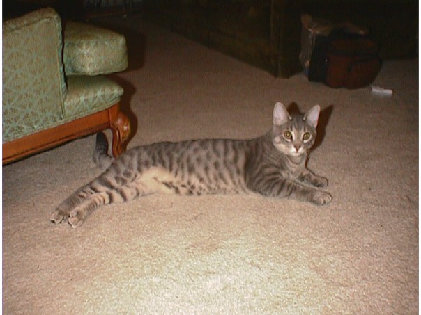 The Cat sitting near the sofa and watching sharp fully. |