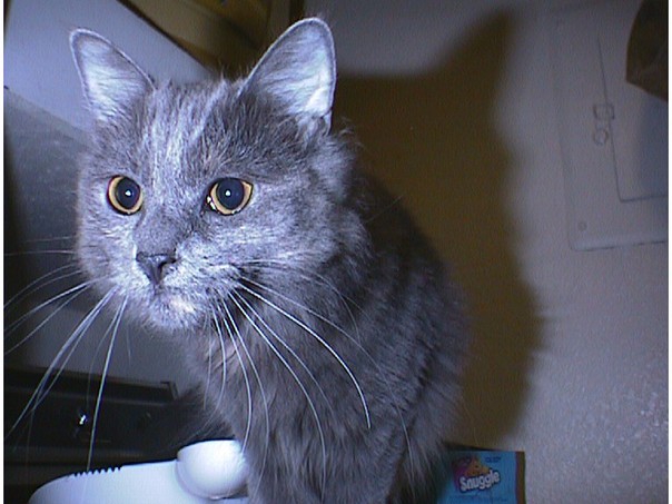 The lights illuminating a golden-eyed cat with long whiskers make it look as if its coat is gray and blue. |