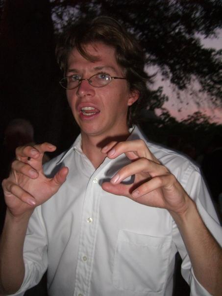 A young man with light brown hair, wearing a white dress shirt and glasses, gesturing with his hands.