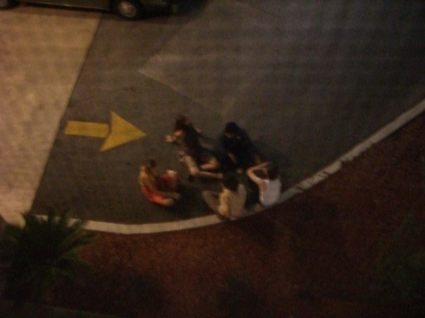 Looking down from a higher floor on five people sitting in the exit of a parking lot