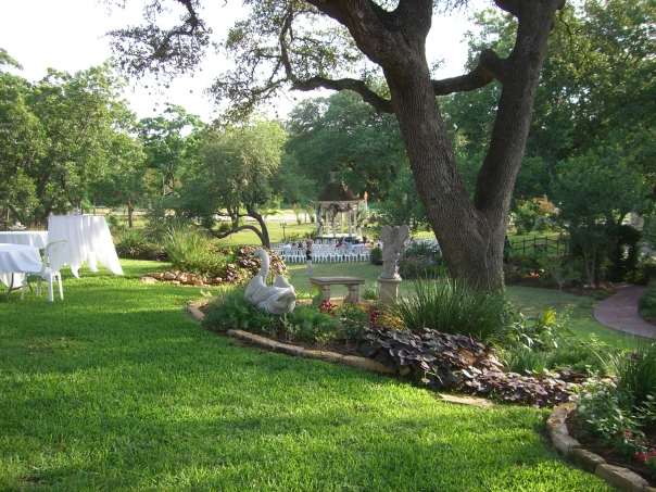A beautifully landscaped garden displays bright green grass, a large swan statue, and numerous flowers in a brick-lined bed.