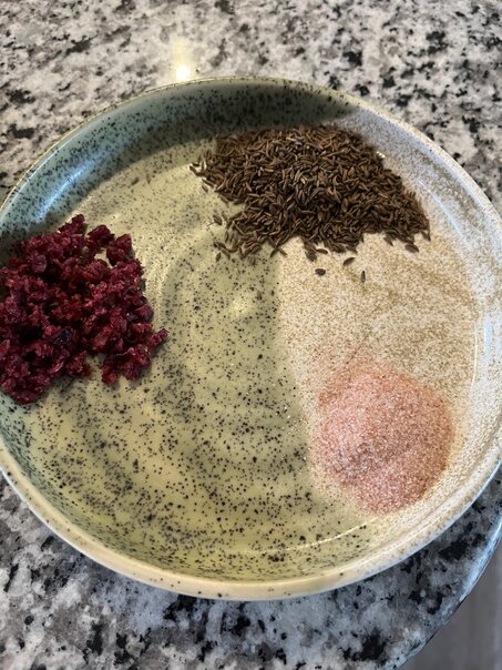 My first full sourdough was a made with plenty of caraway seeds (to get that rye flavor) and some minced cranberries.