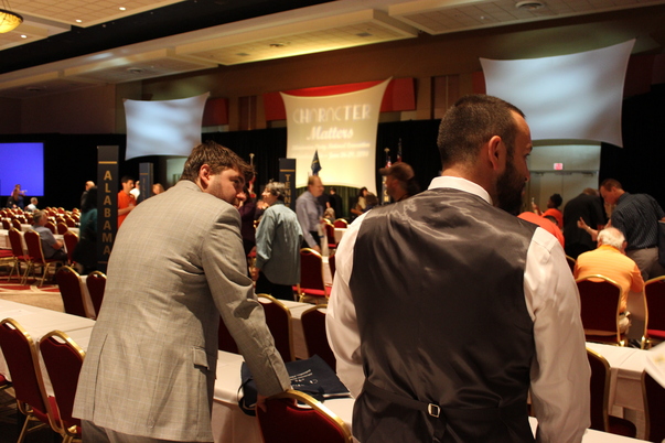 There are a bunch of people formally dressed where there is a screen that says character matters.