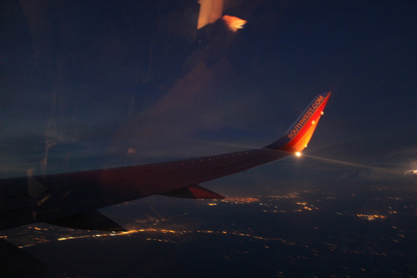 The upward slant of a passenger plane's wing flap as it flies over a lit city below is seen from a window onboard.