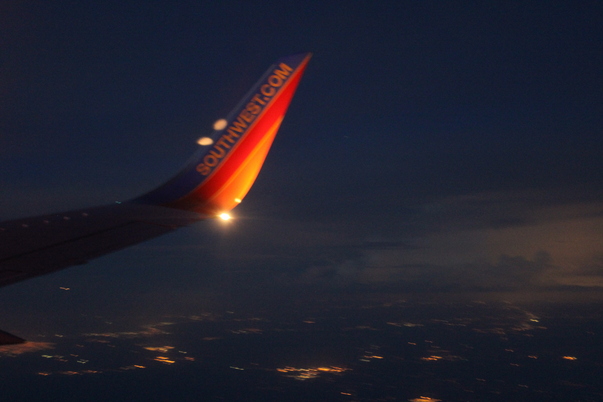 The wing of a South West airplane that is in midflight at dusk.
