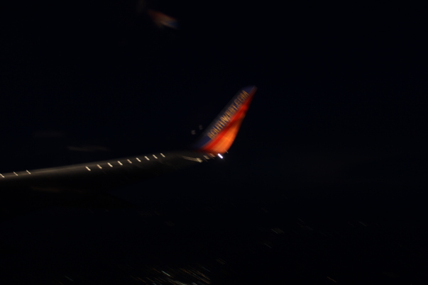 Taken from the passenger window, photo shows the wingtip of a Southwest Airlines plane.