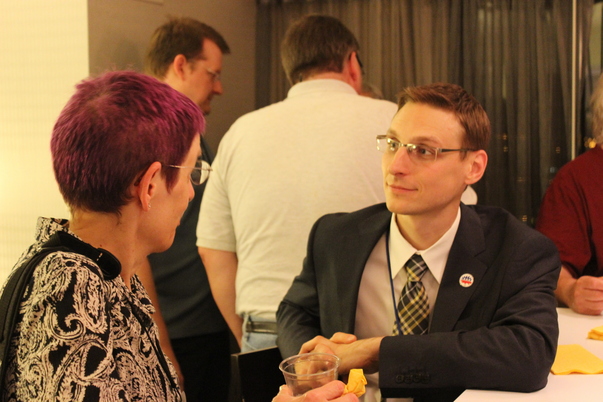 A bespeckled young man is listening with rapt attention to a woman.