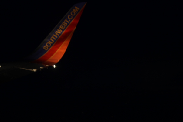 This is a picture of a wing on Southwest airlines in the sky