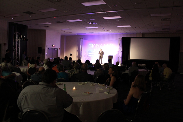 A man in a gray suit is bathed by a bright light during a conference, as he gives the after dinner speech.