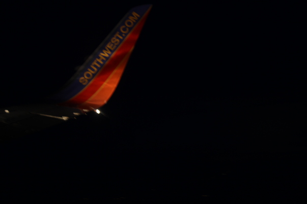 The gray airplane has a bright orange and blue flag advertising what company it comes from.