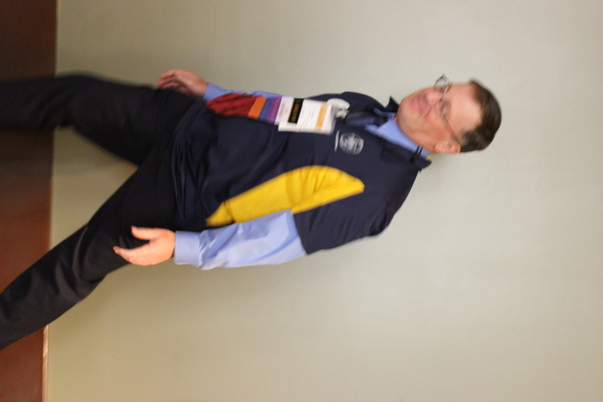 A middle-aged white man with short hair and glasses wears a dark blue and yellow logo shirt and a conference name tag around his neck.
