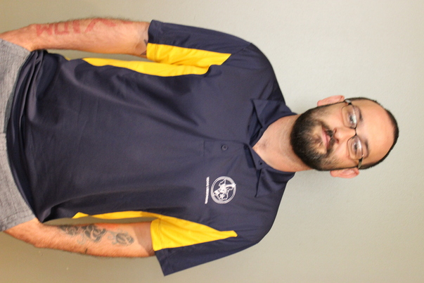 A bearded man with glasses and multiple tattoos is wearing a blue and gold company shirt.