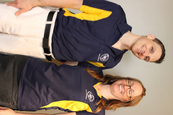 Man posing against a bare wall wearing a blue and gold jersey and holding an eagle trophy.