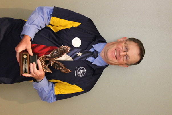 There is a person dressed in a red, white, and blue tie along with the person is holding a trophy.