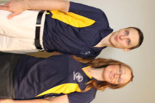 Man and woman smiling in matching work clothes against a white wall.