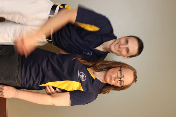 A man and a woman wearing the same Euro-style shirt uniform posing with their arms behind each other's backs.