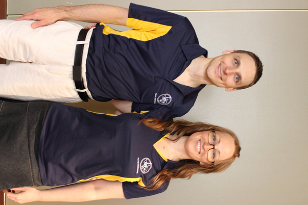 a young smiling couple looks on in a sideways photo wearing navy and yellow shirts.