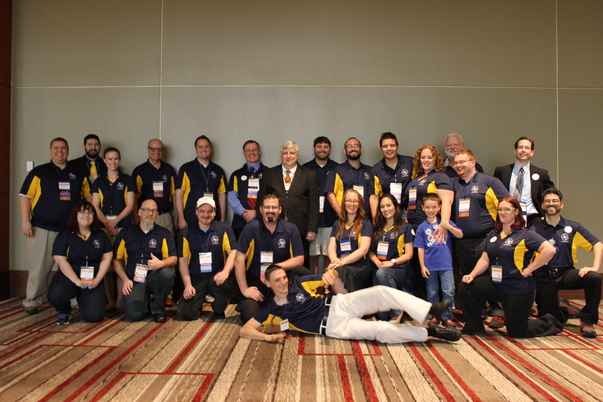A similarly dressed group of people wearing dark purple and yellow shirts pose for a photo in a group competition.