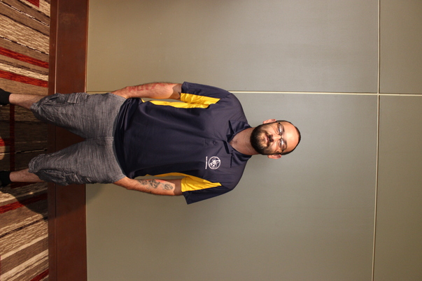 A sideways photo of a man in a gold and blue short sleeved shirt.