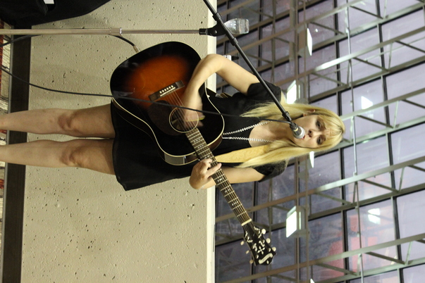A girl wearing black dress and had brown eyes hold piano.She is singing along with her piano.It's looking like a concert is going on here.