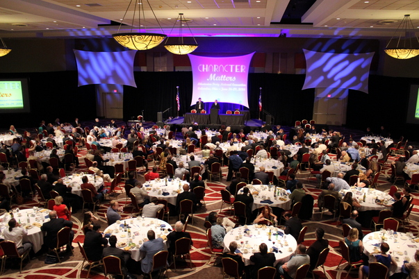 A large profession speaking event in an impressive dining hall with a large projection screen.