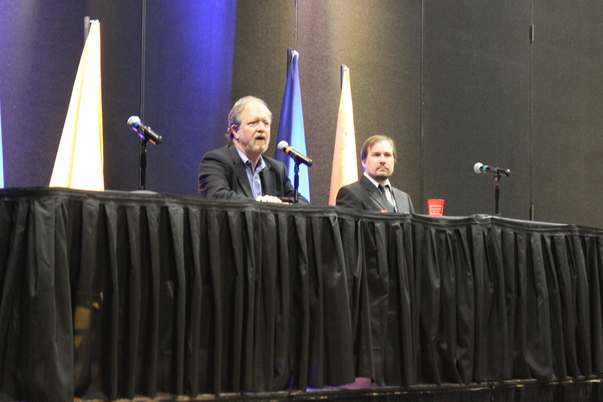 Two men are sitting in front of a row of flags and behind a long black table with microphones on top.