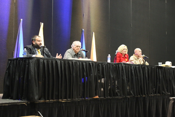 These are four people sitting at a panel at a black table.