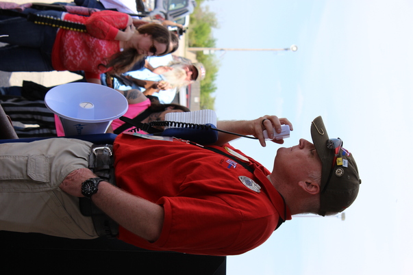 There is a man wearing a baseball cap, black watch, and red polo shirt speaking into a loudspeaker.