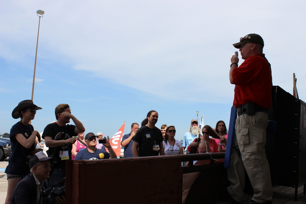 A group of people, some carrying signs, facing a man in a red shirt who is standing on a raised platform.