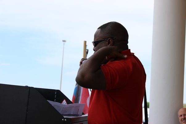 I see a man with a bright orange shirt and dark sunglasses giving a speech.