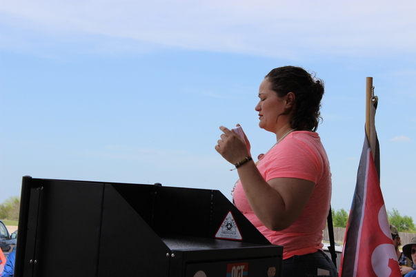 There is a caucasian female wearing a pink shirt, standing next to a podeium on a clear blue skied day.