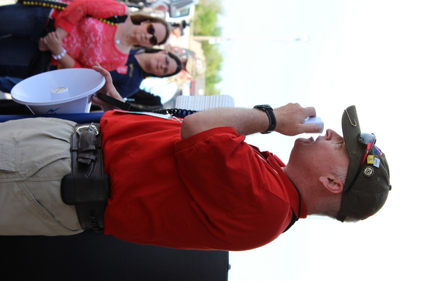 A man wearing a cap, red shirt and khaki pants speaks loudly outside while people stand in attendance.