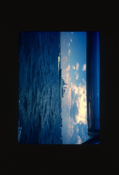 Its a dark blue sea and a ship is sailing aroud there and behid it few small boats are seen |