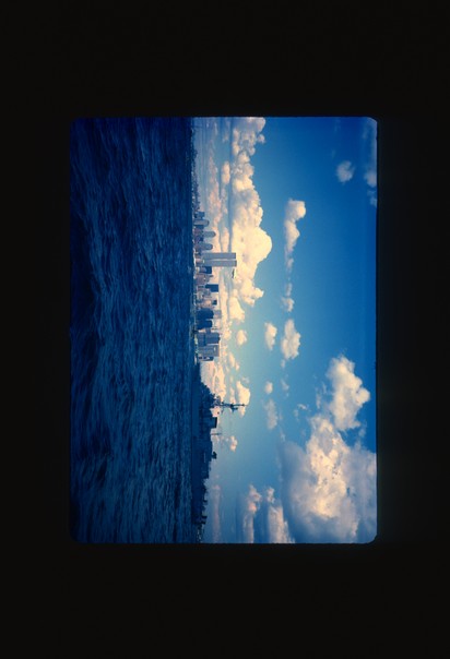 a blue sea and a big ship on it and lot of buildings in the shore. |