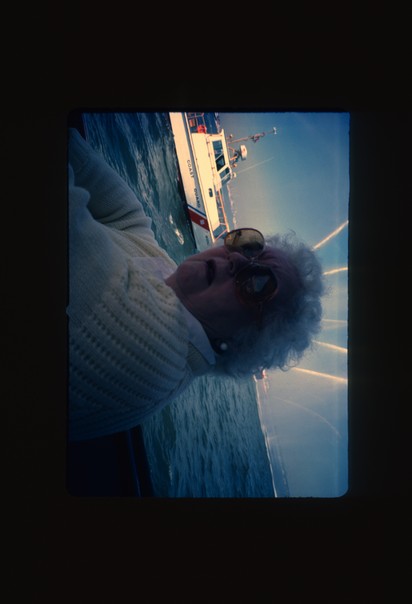 In this pictcure old women is travelling in the shipe and watching sea from the window. |