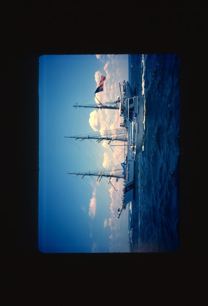 This is a picture of a ship at sail upon the deep blue ocean. |
