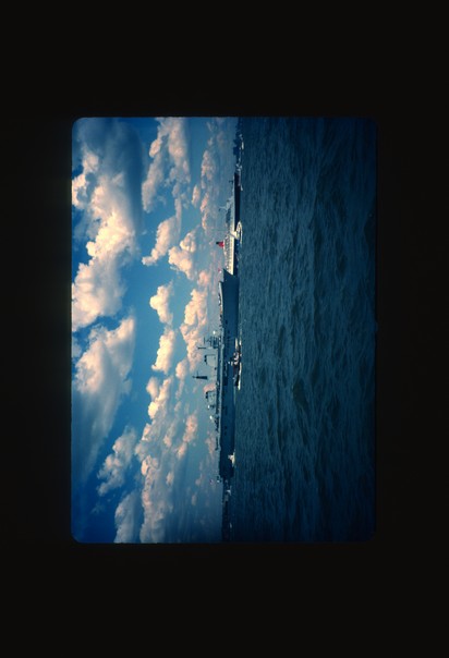 A picture of a large boat on the ocean with a cloudy sky in the background. |