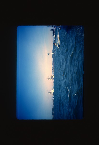 The deep blue choppy waters are enhanced by congested traffic. |