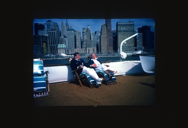 Two well-dressed people lounge in chairs on the deck of a ship that is sailing past a large city.