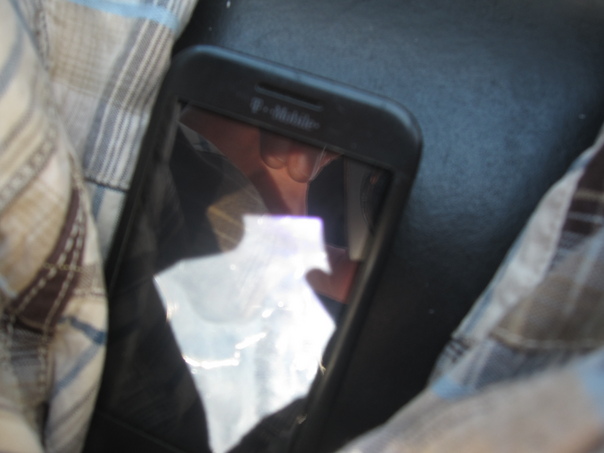 This is a picture of a man holding a tablet, his fingers are reflected on the screen.