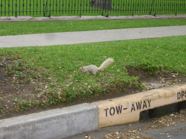 A rare white squirrel scrounges in the green grass alongside a road near a tow-away zone.
