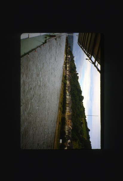 VIEW OF A RIVER BANK FROM A BOAT ON THE RIVER. WATER FLOWING SLOWLY AND SILENTLY BELOW. |