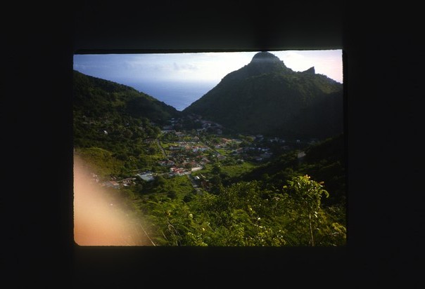 this picture showing mountains at V Shape some plants are there and showing blue sky
