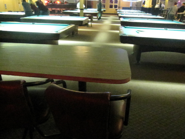 Pool hall is bathed in white light as a lively group of people play a quick game to test their skills.