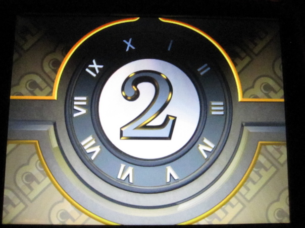 A clock with a two in the center surrounded by Roman numerals sits in a gold outline.