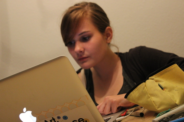 A young woman with dark hair wearing a brown sweater staring at a Mac computer screen