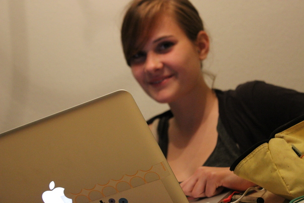 There is a girl with brown hair in a black sweatshirt working on her laptop smiling at the camera.