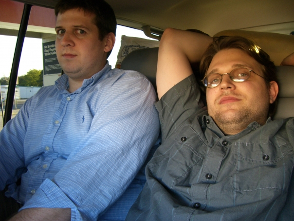 Closeup of two men, late 20's, early 30's, sitting in a car, both wearing button down collared shirts and not looking especially happy.