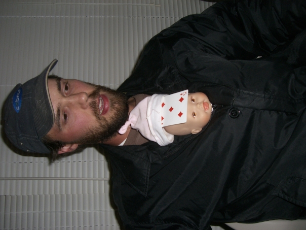 A bearded man wearing a blue baseball style cap and having a babydoll with a card tucked into it's hat peaking out from the top of his jacket.