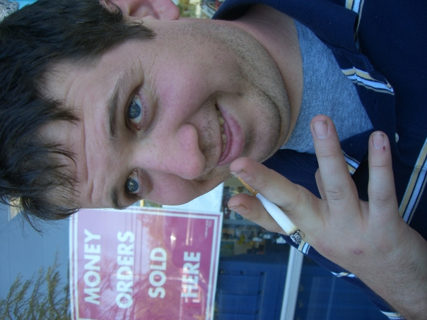 a guy smoking a cigarette in front of a window of shop where money orders are sold